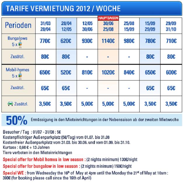 Etwas teurere Alternativen sind Campingplätze, die z. B. Mietzeltemit kompletter Einrichtung oder Mietwohnwägen / Mobil Homes o. ä. oder Ferienhäuser / Bungalows bieten. Hier einmal ein Preisbeispiel aus Südfrankreich: