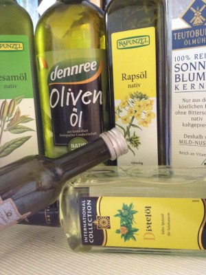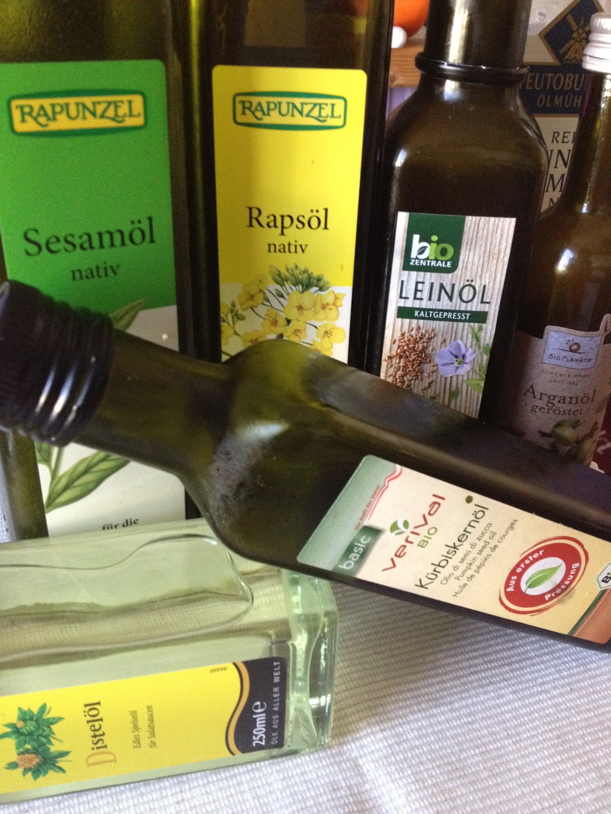 Die meisten Öle solltet Ihr übrigens im Kühlschrank, also kühl und dunkel, aufbewahren, damit sie nicht ranzig werden. Manche Öle wie das Leinöl, müssen innerhalb kürzester Zeit aufgebraucht werden, daher sind davon nur kleine Mengen zu kaufen. Andere Öle werden aber im Kühlschrank fest und dürfen daher eher draußen stehen.