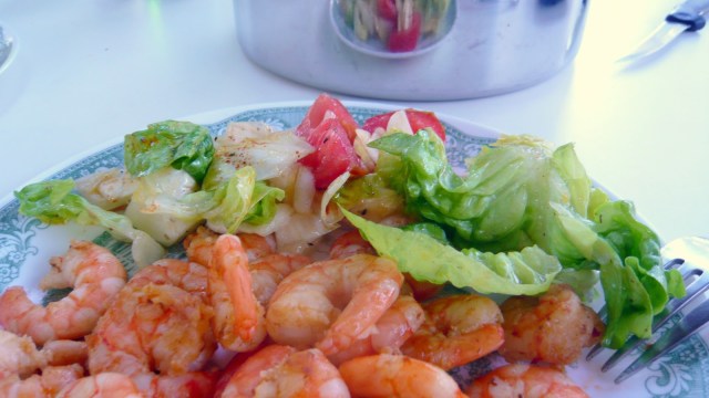 wenn es mal wieder schnell gehen muss… warum nicht ins Kühlfach greifen, schnell ein paar Garnelen andünsten und währenddessen ’nen schnellen gemischten Salat zaubern. So gehts: