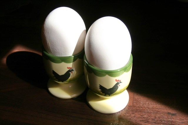 2 hartgekochte Eier (lässt sich sehr gut in die Firma mitnehmen und ist einfach und schnell gemacht, dabei sättigt es super).