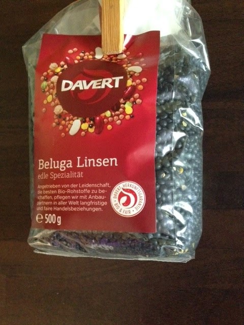 Schwarze Beluga-Linsen mit Kartoffel-Würfeln und Debreziner-Würstel