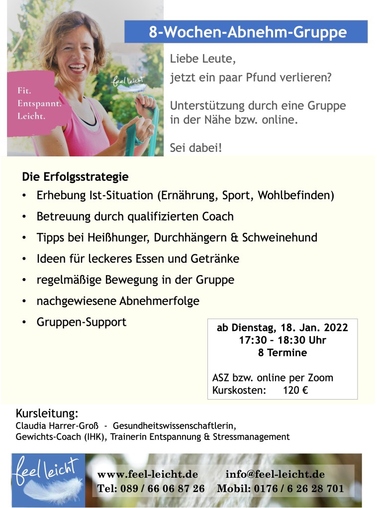 Ruf einfach an unter Tel: 089/66 06 87 26 oder Mobil: 0176/6 26 28 701. Schreibe mir unter info@feel-leicht.de oder über das Kontaktformular.