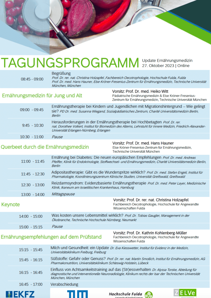 Am Freitag, 27. Oktober 2023 fand das diesjährige Update Ernährungsmedizin des Else Kröner-Fresenius-Zentrum für Ernährungsmedizin in Zusammenarbeit mit der TUM sowie der Hochschule Fulda – dieses Jahr als Online-Veranstaltung – statt.